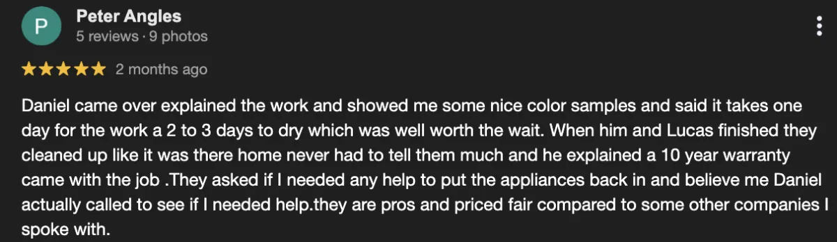 If there is any chipping, peeling, or blistering of your coating within 15 years of our installation, we will come out and fix it for free. Not a cent will come out of your pocket.